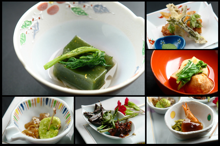 前菜は左からフキ味噌、ヤマウドのキンピラ、一寸豆、中央の写真は飛騨牛しぐれ、コゴミ、ワラビのキンピラ、写真右はなめこの醤油漬け、川えび、フキノトウうま煮。どれも春を感じさせるひと品です。
